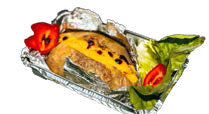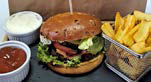 Chiflă, 200 gr. carne de vită, cedar, roşie, castravete murat, bacon salată verde, ceapă caramelizată, ketchup, maioneză, 150 gr. cartofi dippers