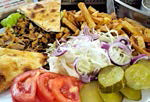 200 gr. carne de pui, 200 gr. cartofi prăjiţi, varză albă+roşie, roşii, castravete murat, sos grecesc sau maioneză, 200 gr. lipie